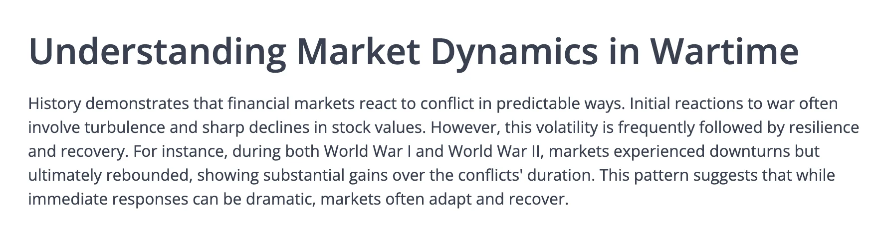 تاریخ همیشه نشون داده که بازارهای مالی نسبت به مسئله جنگ، واکنش های قابل پیش بینی و روشنی دارن. واکنش اولیه به جنگ با آشفتگی و کاهش شدید ارزش سهام همراه هست؛ اما ثابت نیستند و خیلی زود تغییر میکنن. برای مثال سایت equiruswealth.com یه مقاله منتشر کرده با عنوان: مدیریت ثروت در زمان درگیری و گفته، در طول جنگ جهانی اول و دوم، بازارها رکود رو تجربه کردن اما در نهایت دوباره رشد کردن و دستاوردهای قابل توجهی رو در طول مدت درگیریها داشتن.